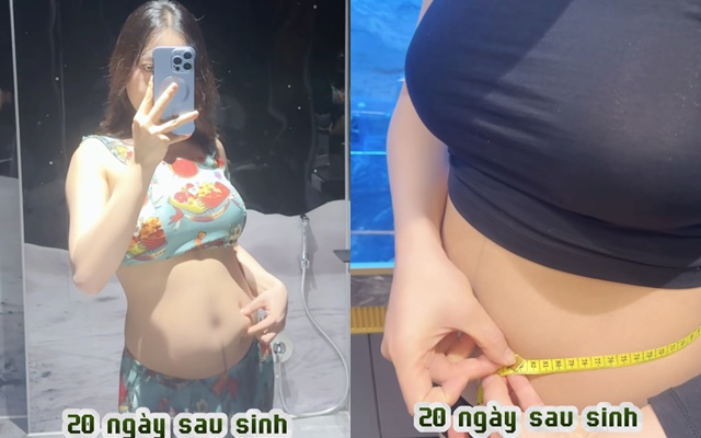 Đây cũng là lần đầu tiên Phương Oanh tiết lộ hình ảnh cận cảnh chiếc bụng sau sinh tầm 15 - 20 ngày của cô, số đo eo vẫn ở mốc 82cm dù cân nặng có giảm. Bà xã shark Bình cho biết, thời gian đó cô khá hoang mang, vì sinh mổ nên phải đợi ít nhất 3 tháng mới có thể tập thể dục. Trong những tháng qua, Phương Oanh áp dụng phương pháp ủ kem và sử dụng đai quấn để giảm số đo vòng 2.