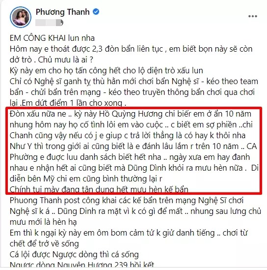 "Hồ Quỳnh Hương, chị biết em ở ẩn 10 năm rồi, nhưng hôm nay họ cố tình lôi em vào cuộc, chị biết em sợ phiền, chị Chanh cũng vậy. Nếu có gì em giúp chị trả lời thẳng là có hay không thôi nha.