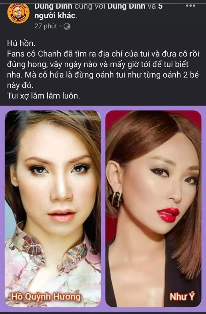 "Hú hồn, fans cô Chanh đã tìm ra địa chỉ của tôi và đưa cô rồi đúng không? Vậy ngày nào và mấy giờ để tôi biết nha. Mà cô hứa là đừng oánh tôi như từng oánh 2 bé này đó. Tôi sợ lắm luôn", Facebook Dũng Đinh chia sẻ.