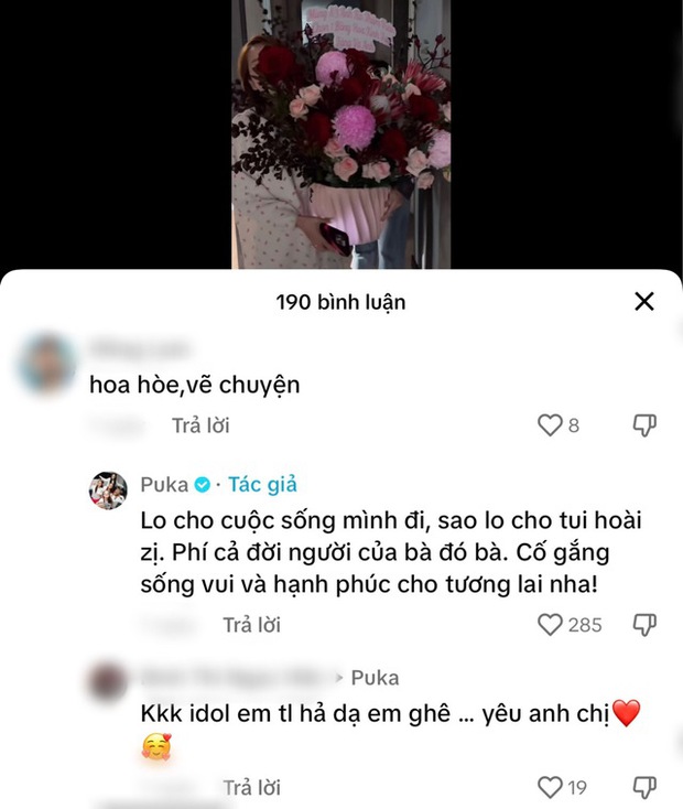 Đáng chú ý, một netizen bất ngờ để lại bình luận chê bai và chỉ trích vợ chồng Puka - Gin Tuấn Kiệt là "hoa hoè, vẽ chuyện". Nữ diễn viên sinh năm 1989 thẳng thắn lên tiếng đáp trả: "Lo cho cuộc sống mình đi, sao lo cho tôi hoài vậy. Phí cả đời người của bà đó bà. Cố gắng sống vui và hạnh phúc cho tương lai nhé".