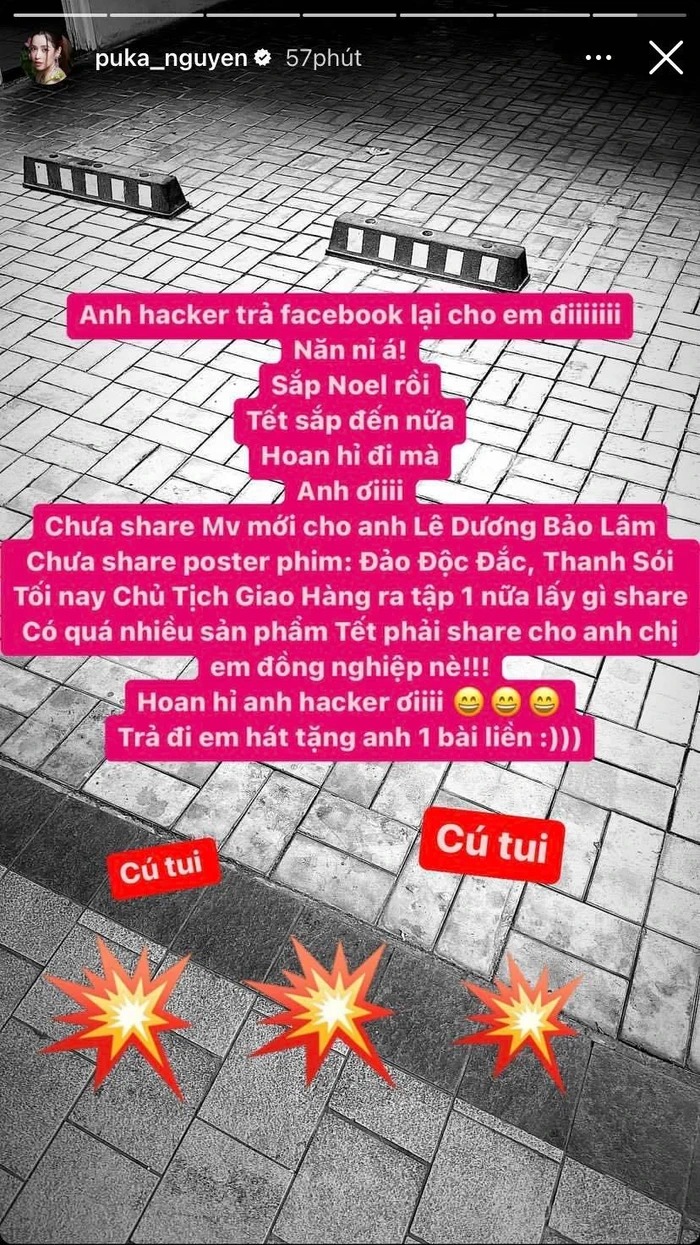 Cụ thể Puka cho biết: "Anh hacker trả Facebook lại cho em đi, năn nỉ á! Sắp Noel rồi, Tết sắp đến nữa, hoan hỉ đi mà anh ơi. Chưa chia sẻ MV mới cho anh Lê Dương Bảo Lâm. Chưa chia sẻ poster phim Đảo Độc Đắc, Thanh Sói. Tối nay Chủ Tịch Giao Hàng ra tập 1 nữa lấy gì chia sẻ. Có quá nhiều sản phẩm Tết phải chia sẻ cho anh chị em đồng nghiệp nè! Hoan hỉ hacker ơi, trả đi em hát tặng anh một bài liền. Cứu tôi cứu tôi".