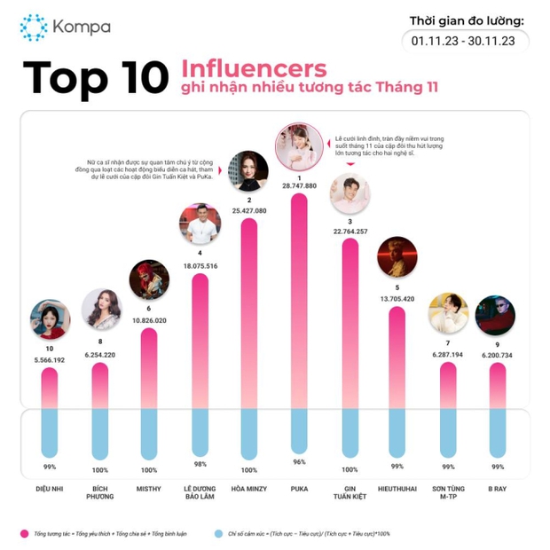 Theo Kompa.ai, Puka và Gin Tuấn Kiệt bắt đầu tổ chức đám cưới từ đầu tháng 11 đến giữa tháng 11. Chuỗi siêu tiệc cưới thu hút sự quan tâm chú ý của cộng đồng mạng xã hội, người dùng tương tác và phản hồi tích cực trước các bài đăng chia sẻ xoay quanh đám cưới, tạo ra hơn 20 triệu lượng tương tác. Ngoài Puka và Gin Tuấn Kiệt, trong Top 10 còn quy tụ nhiều nghệ sĩ đình đám như Hòa Minzy, Lê Dương Bảo Lâm, HIEUTHUHAI...