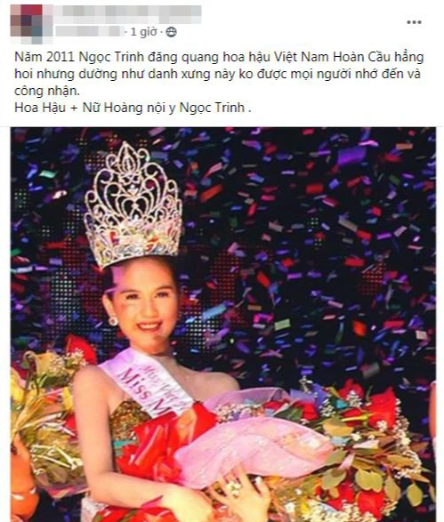 Mới đây, một diễn đàn trên mạng xã hội đã có bài đăng về giải thưởng Hoa hậu Việt Nam Hoàn cầu mà Ngọc Trinh đăng quang vào năm 2011. Người viết bài thắc mắc: "Năm 2011 Ngọc Trinh đăng quang Hoa hậu Việt Nam Hoàn cầu hẳn hoi nhưng dường như danh xưng này không được mọi người nhớ đến và công nhận".