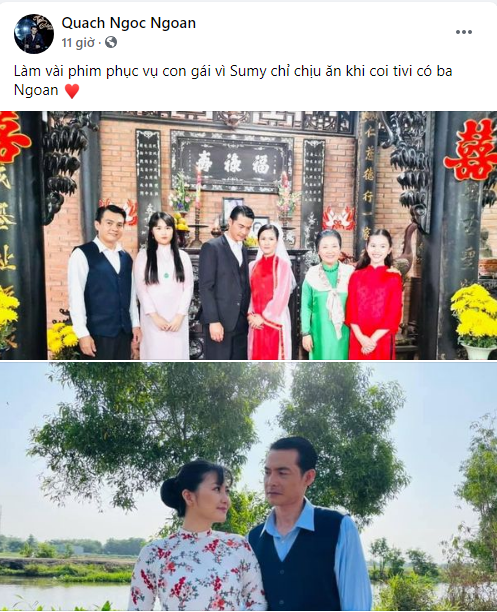 Nam diễn viên cho biết những ngày qua anh bận rộn trên phim trường chỉ để có phim phục vụ con gái. Quách Ngọc Ngoan chia sẻ: "Làm vài phim phục vụ con gái vì Sumy chỉ chịu ăn khi coi tivi có ba Ngoan".