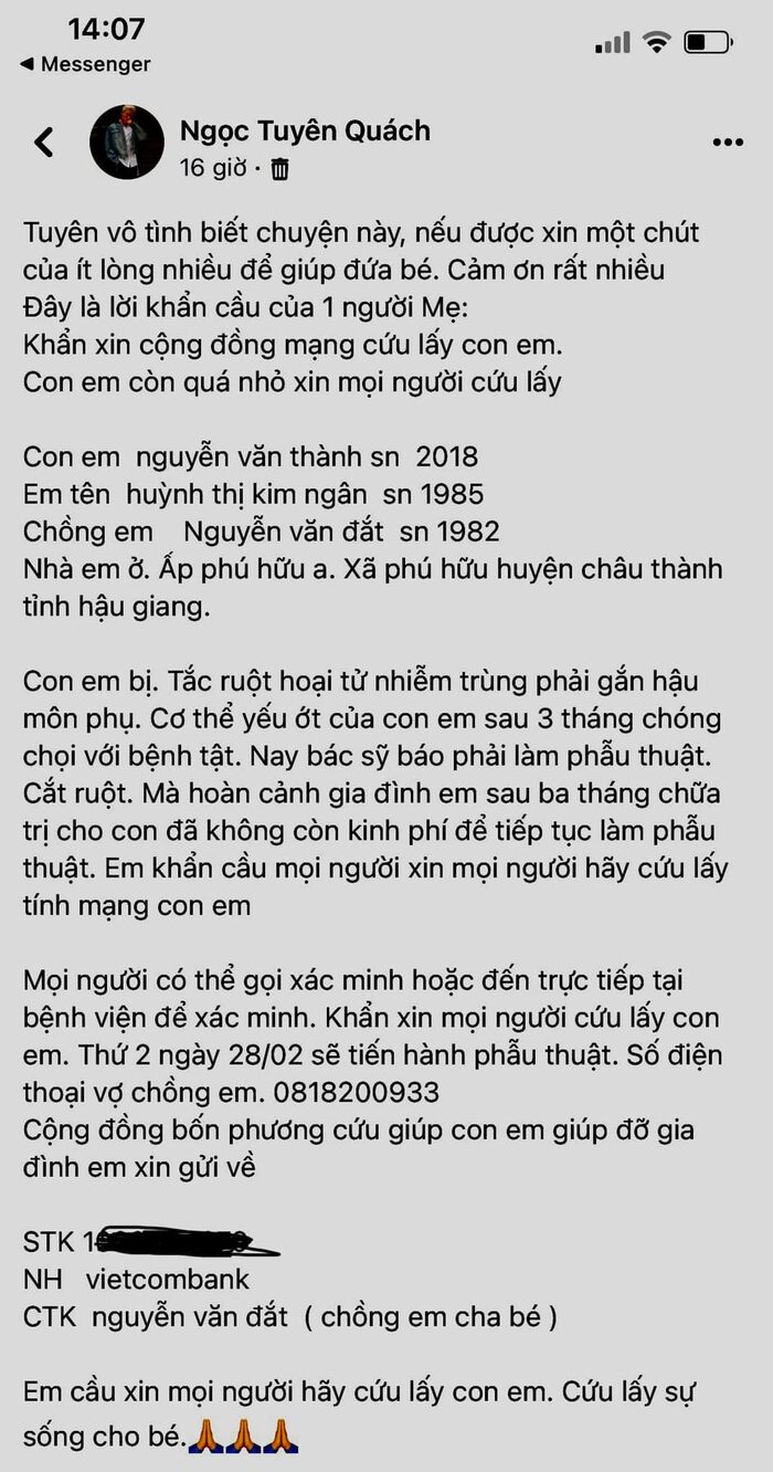 Mới đây, một tài khoản Facebook gây xôn xao khi chia sẻ vụ việc từ thiện ảo kêu gọi tiền để cứu một bé đã mất. Theo đó, Quách Ngọc Tuyên đã đăng bài kêu gọi ủng hộ bé trai cần phẫu thuật gấp. Sau khi đọc bài đăng của Quách Ngọc Tuyên, vị khán giả này đã chuyển cả trăm triệu để ủng hộ.
