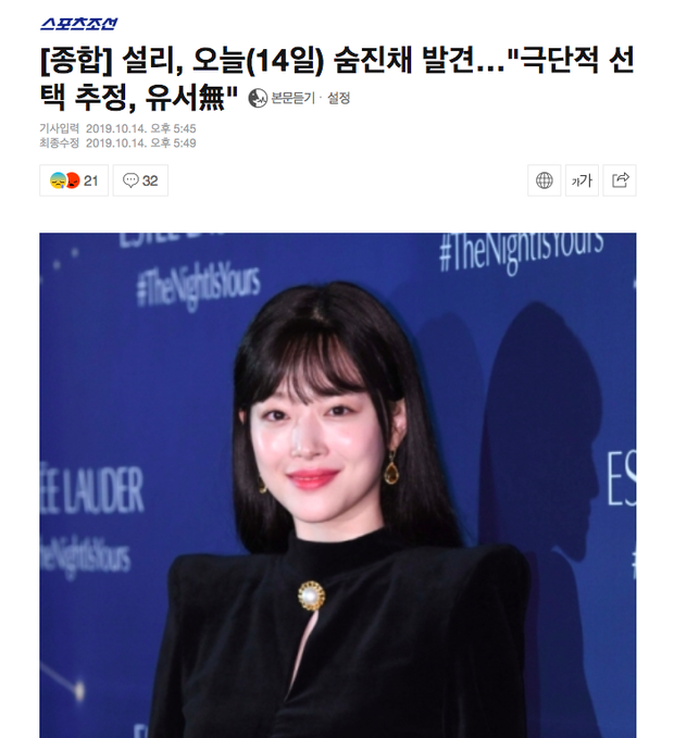 Tiếp tục thông tin liên quan đến vụ Sulli tự tử, theo Sport Chosun đưa tin, sở cảnh sát Seongnam cho biết thi thể Sulli đã được phát hiện tại nhà riêng ở quận Soojung, thành phố Seongnam vào khoảng 3 giờ 21 chiều nay. Người báo cáo đầu tiên là quản lý của Sulli. Anh tìm đến nhà Sulli sau khi mất liên lạc với cô từ tối ngày 13, và phát hiện Sulli đã treo cổ tự vẫn.