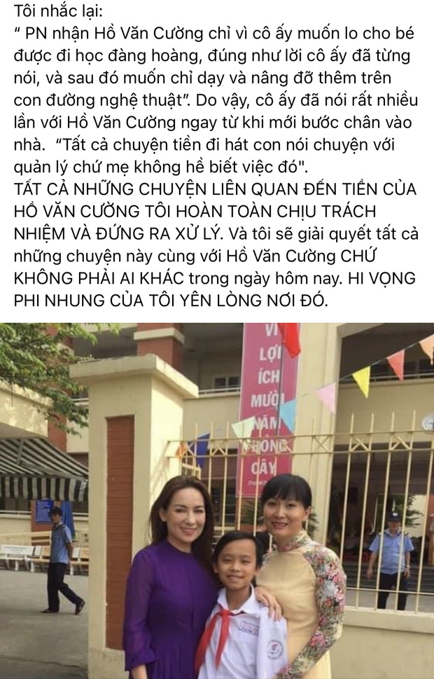 Cuối tâm thư, quản lý ca sĩ Phi Nhung tuyên bố: "Tất cả những chuyện liên quan đến tiền của Hồ Văn Cường tôi hoàn toàn chịu trách nhiệm và đứng ra xử lý. Tôi sẽ giải quyết những chuyện này với Hồ Văn Cường chứ không phải ai khác trong ngày hôm nay. Hi vọng Phi Nhung của tôi yên lòng nơi đó".