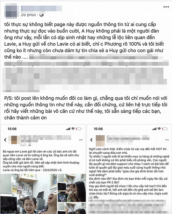 Cụ thể bài đăng của quản lý cũ Mai Phương: "Tôi thực sự không biết page này được nguồn thông tin từ ai cung cấp nhưng thực sự đọc vào buồn cười, anh Huy không phải là một người đàn ông như vậy, mỗi lần có dịp sinh nhật hay những lễ lộc liên quan đến Lavie, anh Huy gửi về cho Lavie có ai biết, chỉ chị Phương rõ 100% và tôi biết cũng không ít nhưng còn chưa dám tự tin chia sẻ anh Huy gửi cho con gái như thế nào...