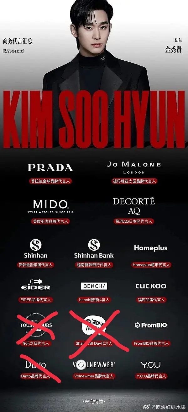 Trưa 3/12, sau khi Viện Garo Sero (nhóm luật sư và cựu phóng viên chuyên đưa tin "thâm cung bí sử" showbiz) tung ảnh Kim Soo Hyun "môi kề môi" với Kim Sae Ron lên MXH, thương hiệu Shabu All Day đã có động thái vô cùng cứng rắn và dứt khoát là xóa, ẩn và gỡ bỏ mọi bài đăng liên quan đến người đại diện Kim Soo Hyun trên trang web, tài khoản MXH chính thức của họ. Việc Shabu All Day "quay xe" cực gắt, công xử lý hình ảnh Kim Soo Hyun cho thấy đối tác đã chạm đáy niềm tin với nam diễn viên.