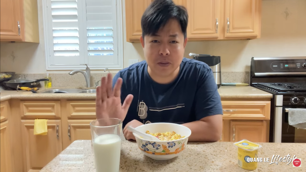 Mới đây, ca sĩ Quang Lê đã đăng tải một clip quay lại cuộc sống của anh tại Mỹ. Mở đầu clip là cảnh Quang Lê vừa ngủ dậy và ngay lập tức tự làm đồ ăn sáng kiểu Mỹ rồi ngồi ăn một mình. Quang Lê ăn rất nhiều, gồm một bát ngũ cốc to trộn sữa, một hộp sữa chua và một cốc sữa tươi. Anh chia sẻ:
