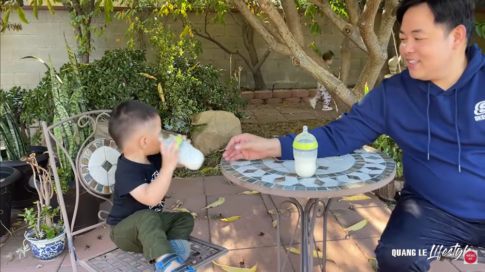 Tưới cây xong, Quang Lê ngồi trông cháu trong vườn. Trong lúc trông, anh còn chơi đùa và dạy cháu học.