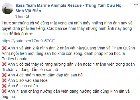 Cụ thể, bài đăng chia sẻ: "Thực sự chúng tôi vô cùng thất vọng khi nhìn thấy những hình ảnh này và quyết định phải lên tiếng. Việc dẫm đạp lên san hô, ngồi lên san hô thực sự nó vô cùng dã man và phản cảm, san hô là động vật, chúng vô cùng nhạy cảm. Những hình ảnh thế này vô cùng đau lòng và xấu xí".
