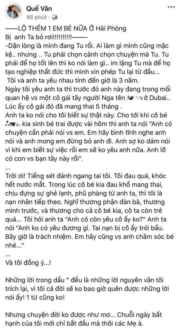 Theo đó trên trang cá nhân, Quế Vân cho biết trong khoảng thời gian yêu nhau, bạn trai trước đó đang trong mối quan hệ với một cô gái người Nga đang mang bầu 5 tháng nhưng cô không hay biết. Sự thật này được chính bạn trai thú nhận với Quế Vân sau khi cô gái người Nga sinh con được vài ngày, cho biết do "tai nạn bị cô ấy trói bầu" và được Quế Vân tha thứ, đồng ý cùng bạn trai chăm sóc con.