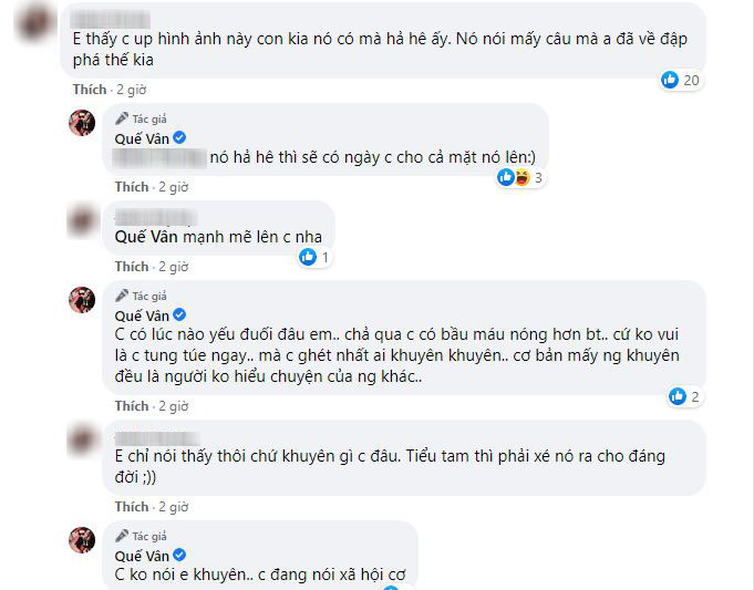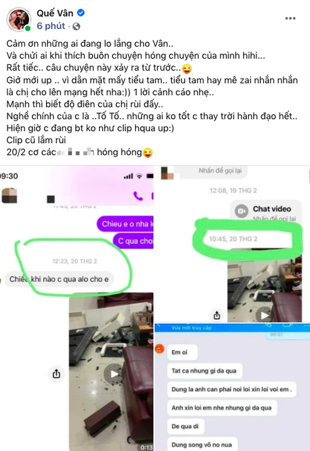 "Cảm ơn những ai đang lo lắng cho Vân và chửi ai khi thích buôn chuyện hóng chuyện của mình. Rất tiếc câu chuyện này xảy ra từ trước giờ mới đăng vì dằn mặt mấy tiểu tam, tiểu tam hay mê trai nhắn nhắn là chị cho lên mạng hết nha. 1 lời cảnh cáo nhẹ. Mạnh thì biết độ điên của chị rồi đấy. Nghề chính của chị là tố tố những ai không tốt chị thay trời hành đạo hết. Hiện giờ chị đang bình thường không như clip hôm qua up. Clip cũ lắm rồi. 20/2 cơ hóng hóng", Quế Vân viết.