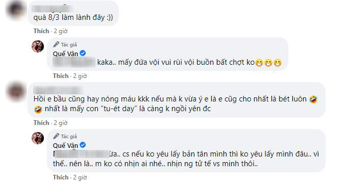 Trước động thái của Quế Vân, đông đảo cư dân mạng đã lên tiếng động viên cô và đồng loạt chỉ trích người đàn ông bội bạc kia. Bên cạnh đó, không ít người tỏ ra ngạc nhiên vì cách đây không lâu, Quế Vân vẫn hạnh phúc khoe bụng bầu 5 tháng, mùng 8/3 còn hào hứng tiết lộ được bạn trai chuyển khoản 2 tỷ, trước khi "bóc phốt" bạn trai chỉ vài tiếng vẫn đăng ảnh selfie với "tướng phu thê" ngọt ngào bên nhau.