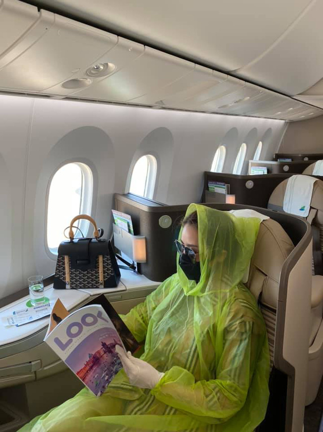 11/03/2020 00:35Quế Vân trùm áo mưa kín mít ngồi máy bay hạng thương gia