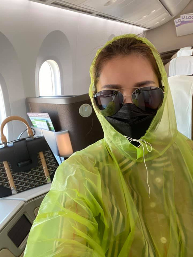 Giữa thời điểm này, buộc phải di chuyển bằng máy bay nên Quế Vân đã có cách bảo vệ mình và những người xung quanh rất độc đáo, đó là mặc áo mưa, trùm kín người, đeo găng tay, khẩu trang và mắt kính không hở tí nào.