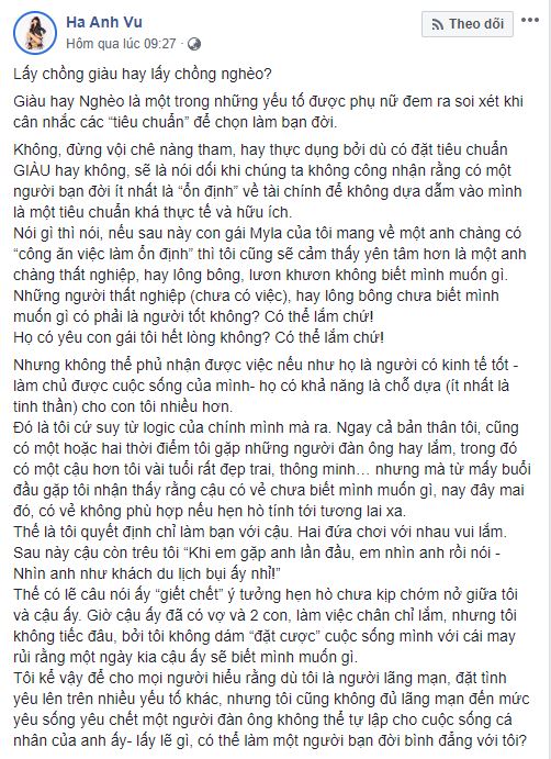 Mới đây, Hà Anh đã đăng tải một dòng tâm sự khá dài về lý do thực sự khiến cô lựa chọn người chồng hiện tại chứ không phải bất kỳ một vị CEO hay đại gia nào khác khiến nhiều người, đặc biệt là hội chị em, cực kỳ thấm thía.