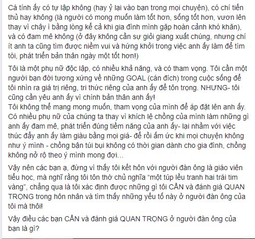 Cuối cùng, siêu mẫu khẳng định: "Vậy nên các bạn ạ, đừng vì thấy tôi kết hôn với người đàn ông là giáo viên tiểu học, mà nghĩ rằng tôi tôn thờ chủ nghĩa “một túp lều tranh hai trái tim vàng”, chẳng qua là tôi xác định được những gì tôi CẦN và đánh giá QUAN TRỌNG trong hôn nhân và tìm thấy những yếu tố này ở người đàn ông của tôi mà thôi!".