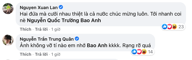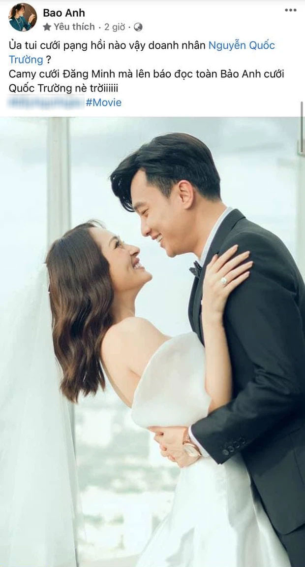 Về phía Bảo Anh, cô nàng cũng đăng tải một khoảnh khắc tương tự, tuy nhiên dòng trạng thái lại trái ngược hoàn toàn: "Ủa tui cưới bạn hồi nào vậy doanh nhân Nguyễn Quốc Trường". Hóa ra những hình ảnh gây xôn xao này thực chất được chụp lại trong một dự án điện ảnh mà Quốc Trường và Bảo Anh cùng góp mặt, trên thực tế cả hai không hề kết hôn như những gì mà người hâm mộ mong đợi. Tuy vậy, dân mạng vẫn dành rất nhiều lời khen cho độ đẹp đôi của Quốc Trường và Bảo Anh, đồng thời nhiệt tình "đẩy thuyền" và mong cả hai thành đôi thật ở ngoài đời.