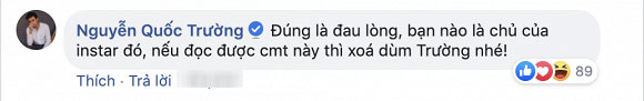 Nam diễn viên cũng nghiêm túc gửi lời đến những người có ý định lợi dụng tên tuổi của anh hãy dừng hành vi đó lại vì sẽ có những vấn đề phức tạp hơn xảy ra chỉ vì chuyện hiểu nhầm này. Quốc Trường cảm thán: "Đúng là đau lòng, bạn nào là chủ của instargram đó, nếu đọc được comment này thì xoá dùm Trường nhé!".