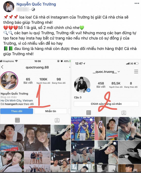 Cách đây ít giờ, nam diễn viên vừa bày tỏ sự bức xúc trên trang cá nhân về việc tài khoản instagram liên tục bị giả mạo khiến người hâm mộ bị nhầm lẫn. Thế nhưng, điều đáng buồn hơn là dù chỉ là giả mạo nhưng những tài khoản "dởm" kia lại có lượt "follow" vào khoảng 80 ngàn - 100 ngàn, cao hơn rất nhiều so với tài khoản thật của Quốc Trường.
