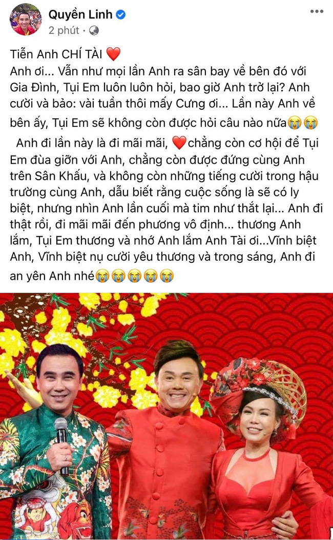 Mới đây, MC Quyền Linh đã có chia sẻ xúc động trên trang cá nhân về lần cuối tiễn người anh thân thiết sang Mỹ. Anh viết: "Tiễn anh Chí Tài. Anh ơi... Vẫn như mọi lần anh ra sân bay về bên đó với gia đình, tụi em luôn luôn hỏi bao giờ anh trở lại? Anh cười và bảo vài tuần thôi mấy cưng ơi... Lần này anh về bên ấy, tụi em sẽ không còn được hỏi câu nào nữa.