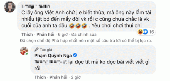 Quỳnh Nga đã có bài phỏng vấn với một trang báo mạng và đề cập thẳng thắn chuyện tái hôn. Ngay lập tức dưới bình luận, một khán giả réo ngay tên Việt Anh để giận dỗi nữ diễn viên: "Chị lấy Việt Anh chứ gì em biết thừa, mà ông này lắm tài nhiều tật bỏ đến mấy đời vợ rồi, chị cũng chưa chắc là vợ cuối của anh ta đâu. Yêu chơi thôi chị".