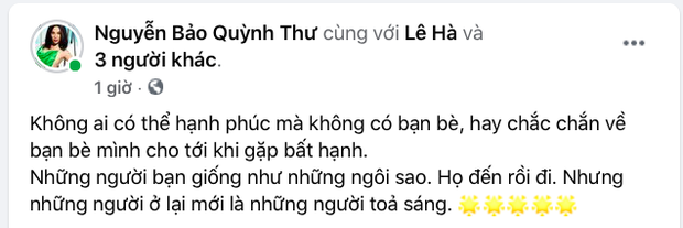 Giữa lúc dân tình rần rần bàn tán, sáng ngày 22/3, Quỳnh Thư bất ngờ có chia sẻ đầy ẩn ý về tình bạn trên trang cá nhân: "Không ai có thể hạnh phúc mà không có bạn bè, hay chắc chắn về bạn bè mình cho tới khi gặp bất hạnh. Những người bạn giống như những ngôi sao. Họ đến rồi đi. Nhưng những người ở lại mới là những người toả sáng".