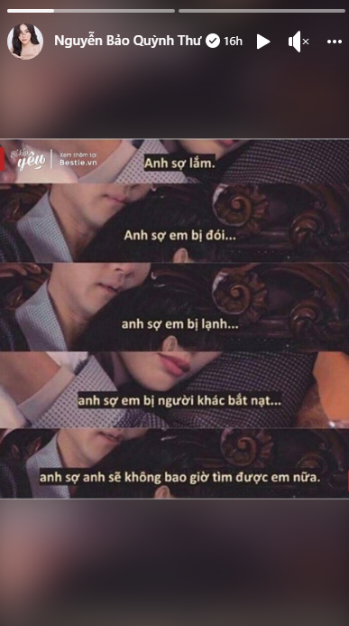Trong bài đăng trên story Facebook cá nhân, Quỳnh Thư đề cập đến 4 nỗi sợ của đàn ông: "Sợ em bị đói, sợ em bị lạnh, sợ em bị người khác bắt nạt, sợ anh sẽ không bao giờ tìm được em nữa".