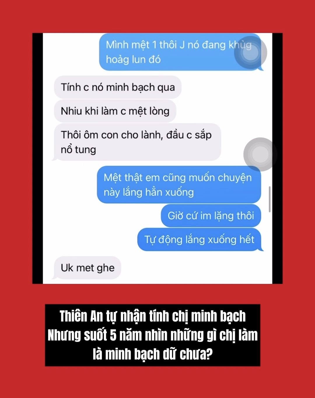 Mới đây, trên kênh mạng xã hội của người tự dưng là quản lý truyền thông của Jack đã tung loạt ghi âm, tin nhắn được cho là của Thiên An đã "thao túng tâm lý" một cô gái lên T.V lên tiếng phốt Jack. Thời điểm 4 năm trước, chính bài đăng của T.V chính là nguồn cơn làm bùng lên bê bối tình ái của Jack. Theo đó, trong đoạn ghi âm được cho là giọng của Thiên An đã nói: "Chị nói xong em suy nghĩ thử, nếu như em thấy ok thì có thể làm. Còn không nếu lương tâm em thấy không cắn rứt thì chị không thúc ép ai hết. Bản thân chị đủ năng lực làm tất cả mọi thứ". Trong loạt tin nhắn, người được cho là Thiên An đã khẳng định mình minh bạch nhưng từng lo sợ việc dùng chung icloud với người cũ sẽ bị lộ bằng chứng...