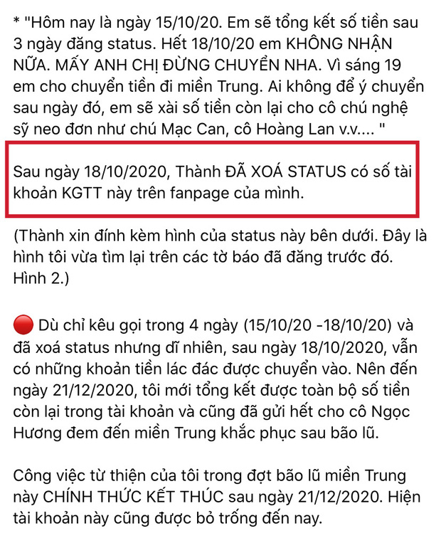 Cụ thể, 1 vài tài khoản MXH loan tin Trấn Thành đã xóa bài viết kêu gọi từ thiện có kèm theo số tài khoản được đăng tải vào 15/10/2020. Nhiều netizen cho rằng nam MC vừa mới xóa gần đây vì nhận nhiều ý kiến tiêu cực. Tuy nhiên, thực chất Trấn Thành đã xóa bài viết này vào 18/10/2020, khoảng thời gian anh kết thúc kêu gọi từ thiện. Thông tin này cũng được nam MC thông báo trong bài viết tung 1.000 trang sao kê vào ngày 7/9/2021.