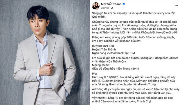 Sau khi Trấn Thành tung 1.000 trang sao kê từ thiện, trên MXH bùng nổ nhiều ý kiến trái chiều, nhiều người còn chỉ ra chi tiết trên tờ sao kê ngân hàng của nam MC và cho rằng không hợp lý. Chưa dừng lại, đến tối 11/9, cả cõi mạng tiếp tục xôn xao thông tin Trấn Thành bất ngờ xóa bài đăng kêu gọi từ thiện vào mùa lũ năm 2020.
