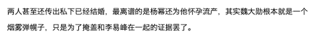 Trang QQ đưa tin, trên MXH đang đồn thổi thông tin gây chấn động. Theo đó, Dương Mịch và Lý Dịch Phong đã bí mật kết hôn với nhau. Nữ diễn viên làm sẩy thai con chung của hai người, Ngụy Đại Huân chỉ là "bình phong".