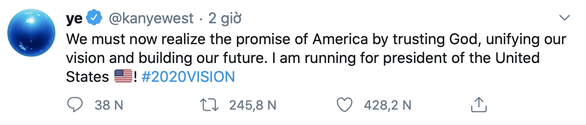 "Giờ chúng ta phải nhận ra triển vọng của nước Mỹ bằng cách tin vào Chúa, thống nhất tầm nhìn và xây dựng tương lai. Tôi đang tranh cử tổng thống Mỹ", Kanye West viết trên Twitter, cùng hình cờ Mỹ và hashtag #2020VISION.