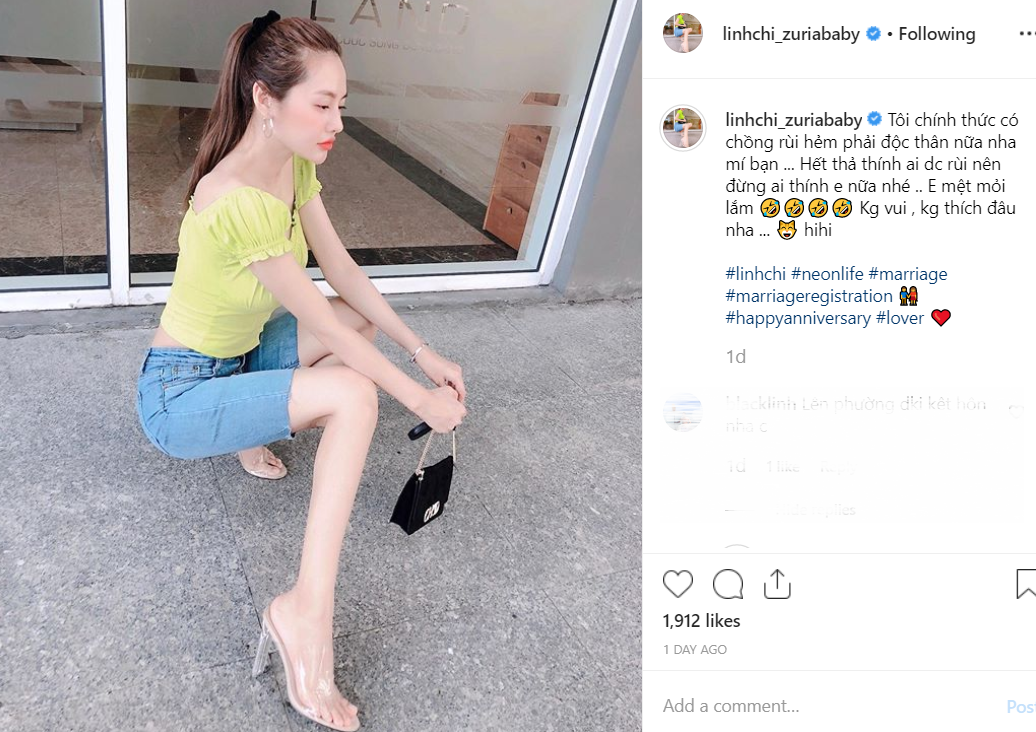 "Tôi chính thức có chồng rùi, hẻm phải độc thân nữa nha mấy bạn. Hết thả thính ai được rồi nên đừng ai thính em nữa nhé. Em mệt mỏi lắm. Không vui, không thích đâu nha.", Linh Chi viết.