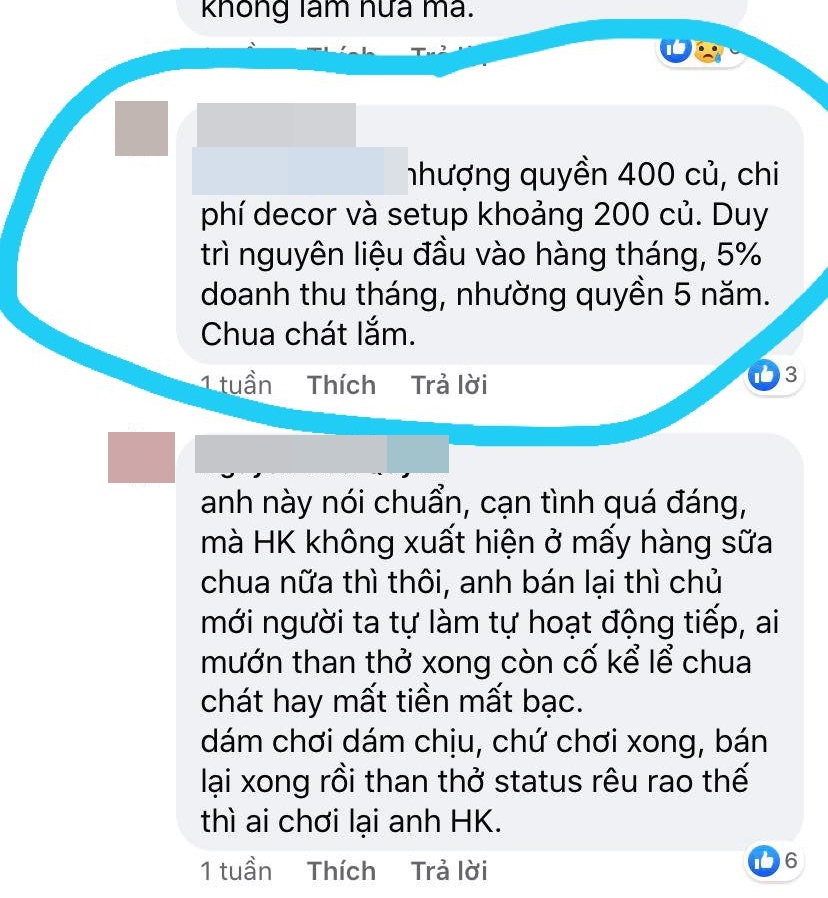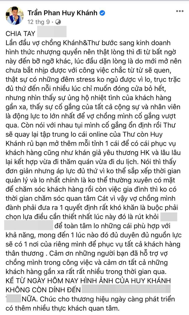 "Cái gì của mình là của mình, mình không làm nữa cũng phải nói và thông báo chứ. Nếu lỡ mai kia hình ảnh anh không tốt thì có phải anh vô tình làm ảnh hưởng đến thương hiệu không. Và nếu bất cứ chi nhánh nào lấy hình ảnh anh thì có phải anh mang tiếng gạt khách hàng không. Mong em hiểu", Huy Khánh đáp lại lời chê trách của dân mạng.