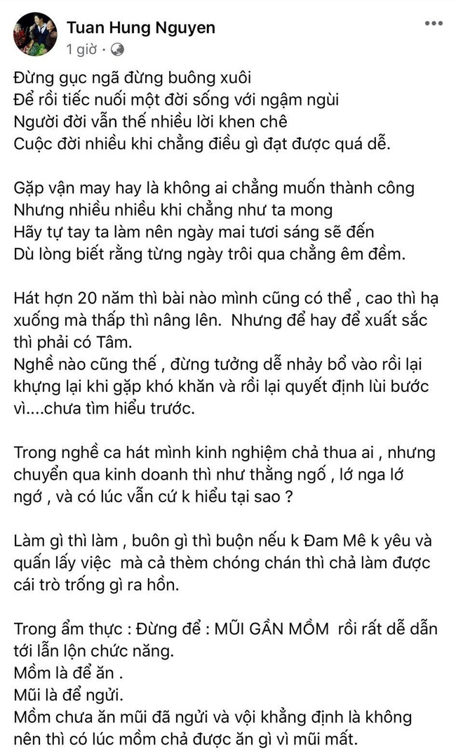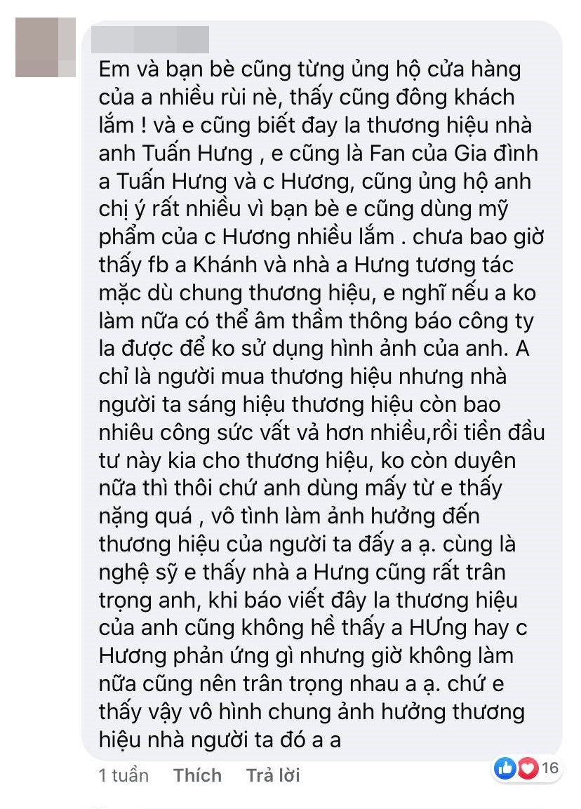 "Em nghĩ nếu anh không làm nữa có thể âm thầm thông báo công ty là được, để không sử dụng hình ảnh của anh. Anh chỉ là người mua thương hiệu còn người ta sáng lập ra thương hiệu, còn bao nhiêu công sức vất vả hơn nhiều… Anh dùng mấy từ em thấy nặng quá, vô tình làm ảnh hưởng thương hiệu người ta đấy anh ạ. Cùng là nghệ sĩ em thấy nhà anh Hưng cũng rất trân trọng anh", một cư dân mạng bày tỏ quan điểm.