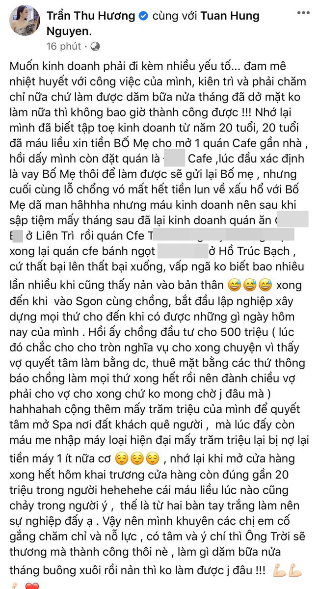 Về phía vợ chồng Tuấn Hưng, dù không trực tiếp nhắc tên Huy Khánh nhưng những bài đăng gần đây của hai người đều đề cập đến chữ "tâm" và sự kiên trì trong kinh doanh. Trong khi Tuấn Hưng tâm sự: "Nghề nào cũng thế, đừng tưởng dễ nhảy bổ vào rồi lại khựng lại khi gặp khó khăn và rồi lại quyết định lùi bước vì chưa tìm hiểu trước… Nếu không đam mê, không yêu và quấn lấy công việc mà cả thèm chóng chán thì chả làm được trò trống gì ra hồn" thì bà xã của anh cũng ẩn ý: "Cố gắng chăm chỉ và nỗ lực, có tâm và ý chí thì ông trời sẽ thương mà cho thành công thôi, dăm bữa nửa tháng buông xuôi rồi nản thì không làm được gì đâu".