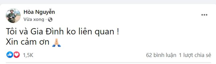 Tối 19/3, Hòa Minzy bất ngờ đăng tải dòng trạng thái gây xôn xao: "Tôi và gia đình không liên quan. Xin cảm ơn".