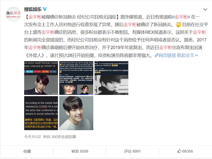Hiện tại, tin tức này vẫn chưa được xác thực, công ty quản lý của Kim Woo Bin cũng chưa lên tiếng phản hồi nhưng từ khóa "Kim Woo Bin" đã bắt đầu lọt top tìm hiếm ở mạng xã hội Weibo của Trung Quốc.