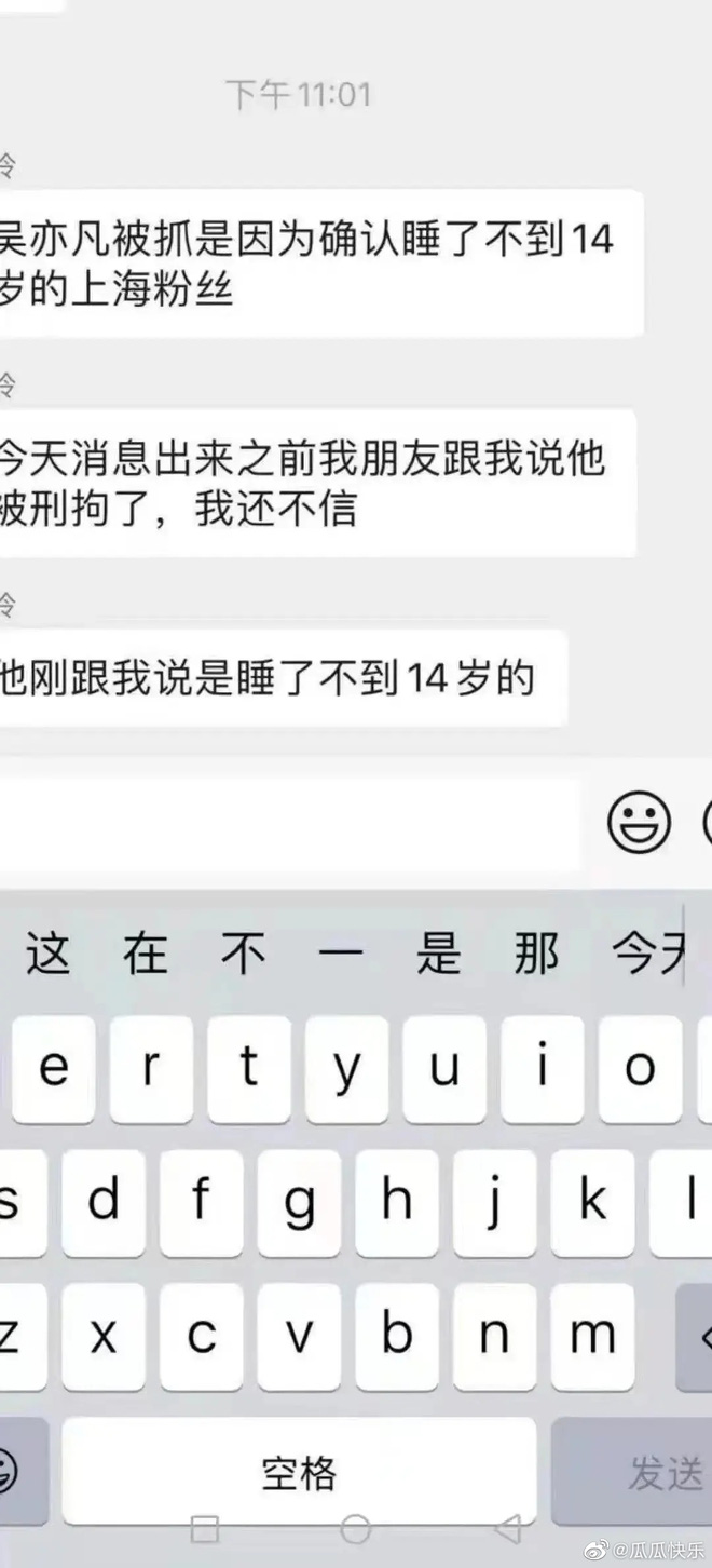 Trong 1 diễn biến khác, trang QQ chia sẻ thêm 1 hình ảnh chụp màn hình có nội dung cho hay, vẫn còn có 1 bằng chứng khác về việc Ngô Diệc Phàm hiếp dâm tập thể trẻ vị thành niên khiến cô bé mang bầu nhưng phải phá thai, hiện tại tình hình sức khoẻ rất tồi tệ, còn bị rụng tóc.