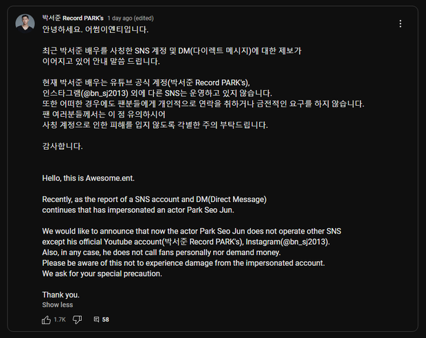 Awesome Entertainment - công ty quản lý của Park Seo Joon vừa ra thông báo chính thức làm rõ tin đồn qua kênh YouTube chính thức của anh (Record PARK's): "Gần đây, xuất hiện 1 tài khoản mạo danh Park Seo Joon. Chúng tôi xin khẳng định Park Seo Joon hiện tại đang sử dụng 2 tài khoản chính thức là kênh YouTube này và tài khoản Instagram (@bn_sj2013). Park Seo Joon chưa bao giờ gọi điện cho fan cũng như không bao giờ đòi tiền họ. Chúng tôi hy vọng công chúng hãy nâng cao tinh thần cảnh giác để không dính bẫy lừa đảo từ tài khoản mạo danh nghệ sĩ".