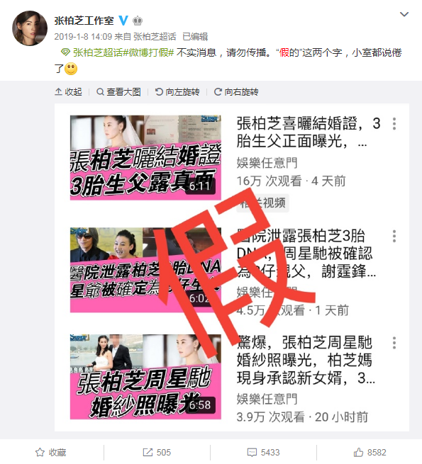 Ngày 13/5, một kênh marketing lớn bất ngờ đăng tải thông tin Trương Bá Chi muốn kết hôn cùng Châu Tinh Trì và cho biết ông "vua hài" chính là cha ruột của cậu quý tử thứ ba nhà nàng Tinh nữ lang. Không chỉ có thế, tài khoản marketing này còn chia sẻ ảnh chụp màn hình những bài viết của truyền thông Hong Kong về việc này.