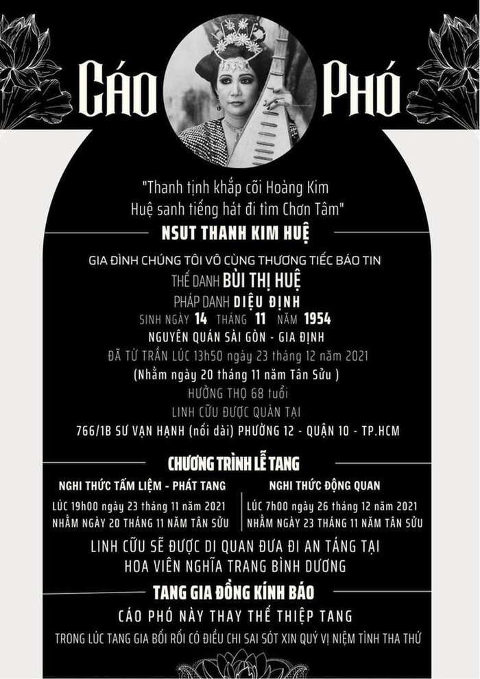 Ngày 23/12, người hâm mộ đã bàng hoàng trước thông tin NSƯT Thanh Kim Huệ qua đời sau thời gian kiên cường chống chọi căn bệnh ung thư. Sự ra đi của nữ nghệ sĩ đã để lại niềm xót thương cho đồng nghiệp, bạn bè lẫn khán giả. Lễ tang của NS Thanh Kim Huệ được diễn ra tại nhà riêng.