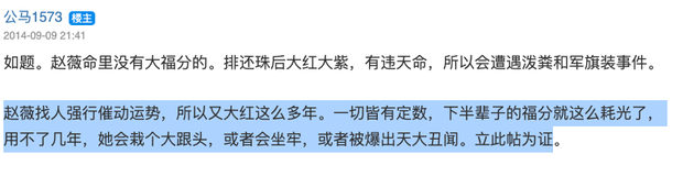 Người viết tiếp tục nói rõ: "Triệu Vy dồn ép vận may cho chính mình nên mới nổi tiếng bao nhiêu năm như vậy. Tất cả đều đã định sẵn, phúc phần nửa đời sau của cô ta sẽ bị cạn kiệt. Mấy năm nữa thôi, cô ta sẽ có cú 'ngã ngựa', hoặc là phải ngồi tù, hoặc là bị tố có bê bối tày trời. Tôi viết ra ở đây để có cái làm chứng".