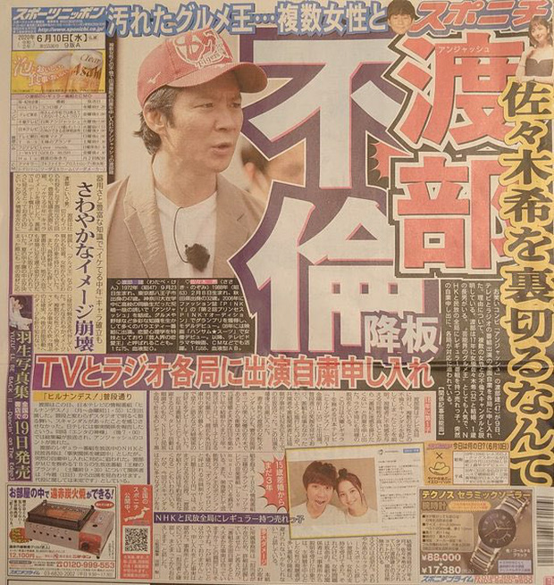 Không chỉ diễn viên cấp 3, danh hài này có quan hệ với cả những nữ nhân viên trong công ty quản lý. Ngay sau khi tin tức được đăng tải, Ken Watabe đã thông qua công ty để thừa nhận lỗi lầm và gửi lời xin lỗi tới vợ, gia đình và cả công chúng.