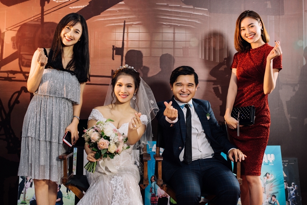 Lan Ngọc (phải) dự tiệc cưới của Võ Thanh Hòa. Trong Cánh đồng bất tận, cô đóng chị anh nhưng ngoài đời kém một tuổi. Ảnh: Nhân vật cung cấp.