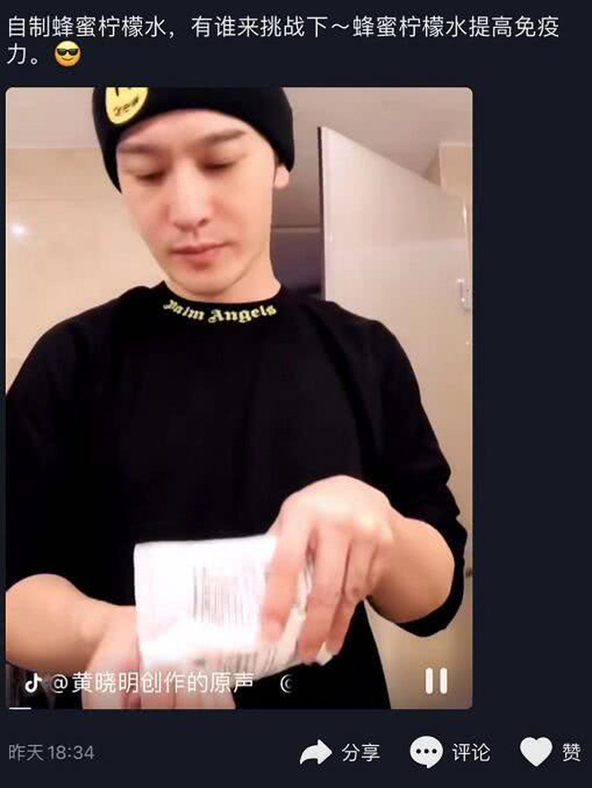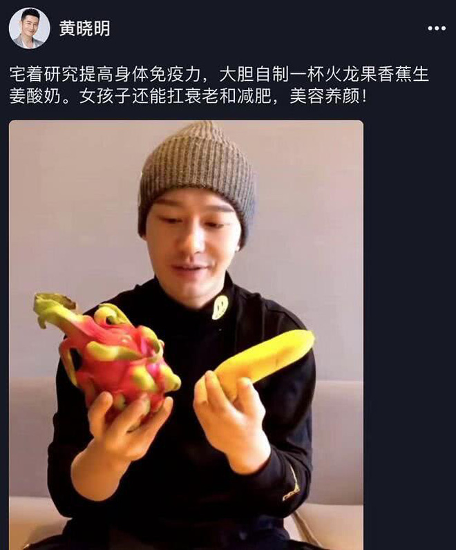 Huỳnh Hiểu Minh vốn là ngôi sao luôn chuyên tâm với các hoạt động từ thiện, giúp đỡ cộng đồng. Trong thời gian đại dịch bùng phát như hiện nay, dù rằng phải ở nhà nhưng nam diễn viên đã chia sẻ những clip hết sức bổ ích về các công thức nước uống nâng cao khả năng miễn dịch. Trên Weibo, Huỳnh Hiểu Minh hướng dẫn mọi người cách thức pha nước chanh mật ong, sinh tố thanh long chuối gừng, ngoài ra còn có các bài tập vận động tại nhà.