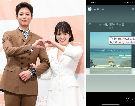 Gần đây, cư dân mạng cũng đã "soi" được Song Joong Ki luôn có động thái mỗi lần vợ cũ lên mặt báo với những tin đồn tình cảm. Không rõ là vô tình hay cố tính nhưng những hành động này đều khiến công chúng "bán tín bán nghi", cho rằng Song Joong Ki muốn chứng tỏ bản thân vẫn ổn hoặc "dằn mặt" người cũ. Cũng có người cho rằng, có thể mọi chuyện chỉ là trùng hợp ngẫu nhiên.